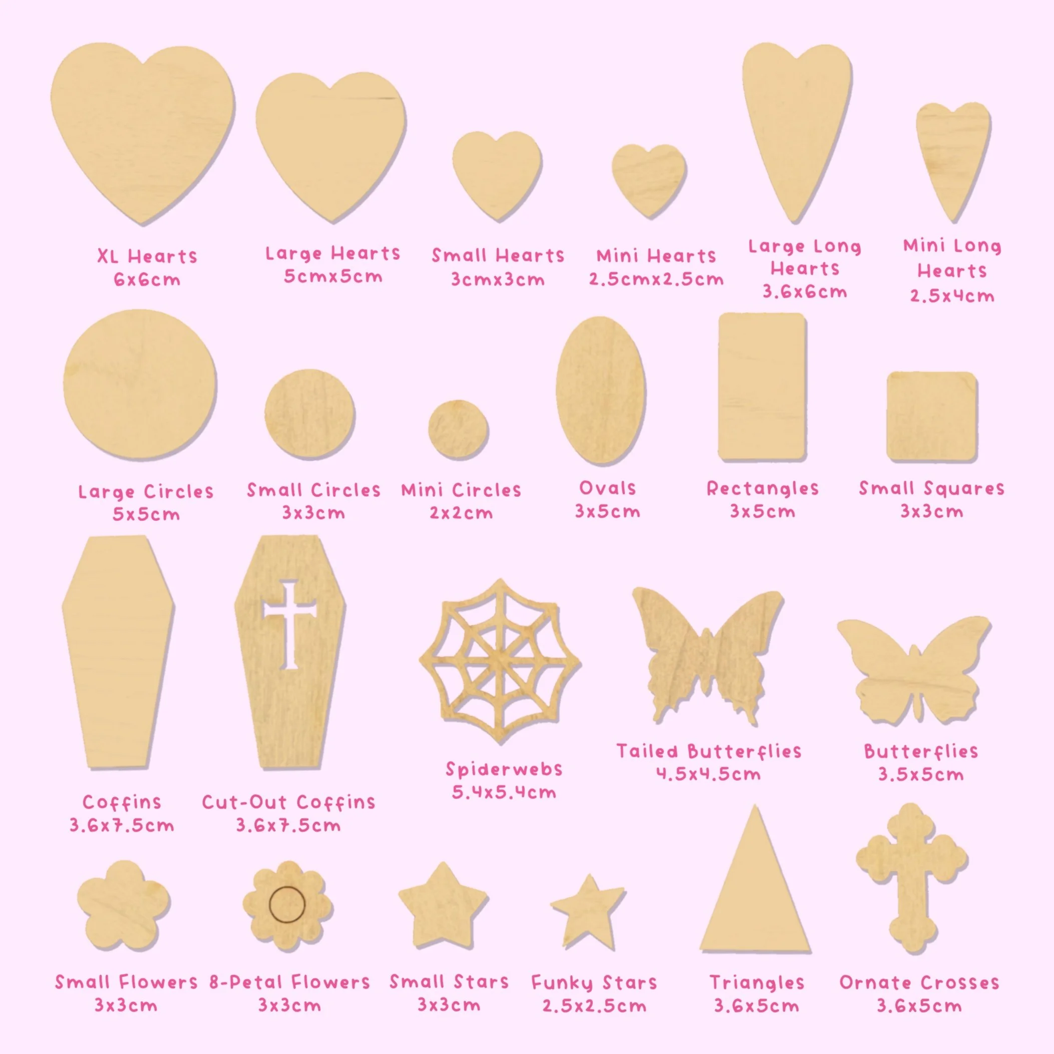 Interested in some custom jewellery or art on my usual wood pieces? I got you! Below is a simple guide as to the size and shapes of wood pieces I currently have available. I often buy new shapes and sizes, so keep an eye out as this guide may change from time to time, but these are my go-to staple items! Again, just drop me a message with your ideas and I’m sure we can make something amazing together!