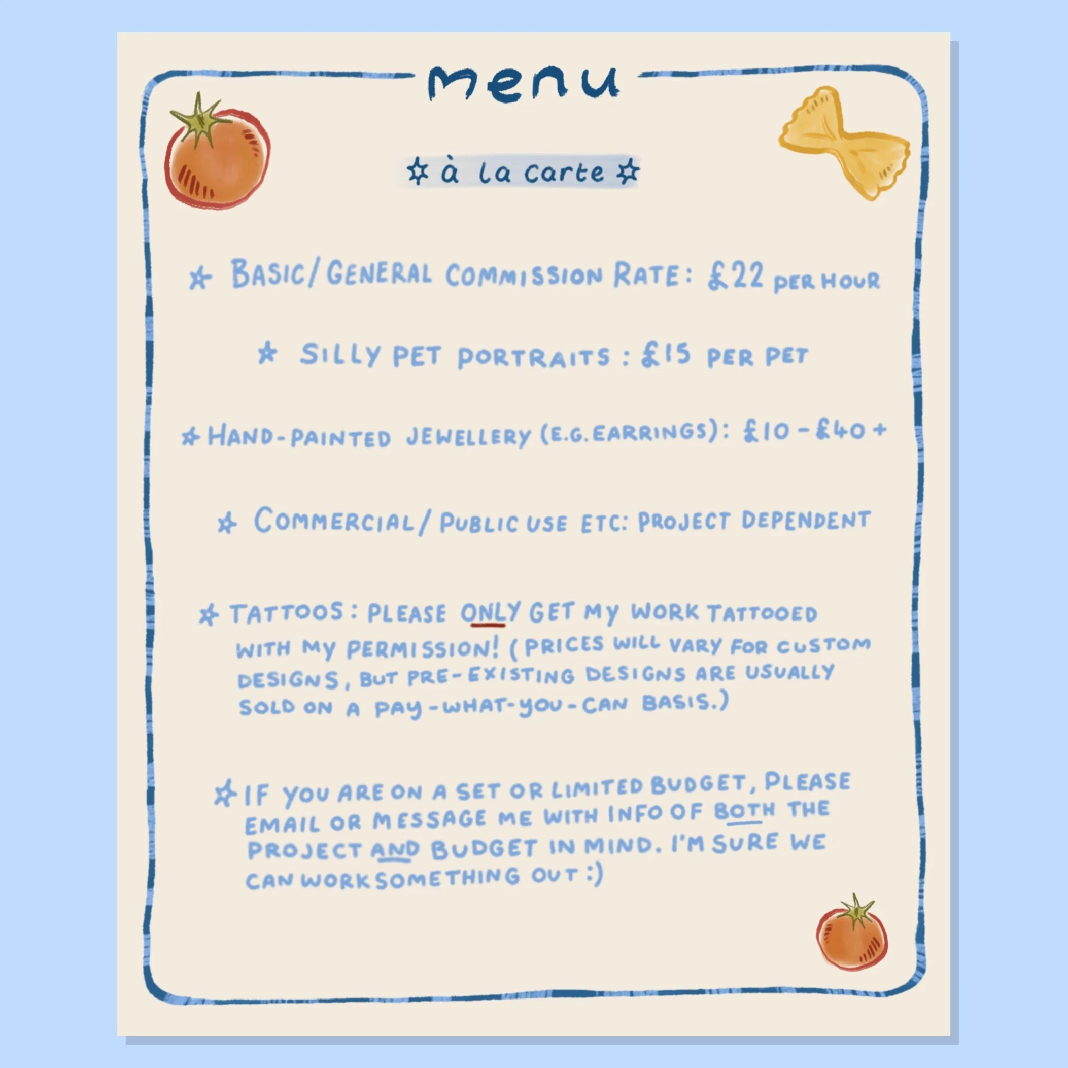 Interested in something totally unique to you? You’re in the right place! I accept commissions and custom orders! Below is my commission ‘menu’, which is a rough pricing guide to give you an estimate as to what your project might cost. However, as mentioned at the very bottom- This is JUST a guide, and if you have a tight or set budget in mind, I’m sure we can work something out together. Just get in touch!