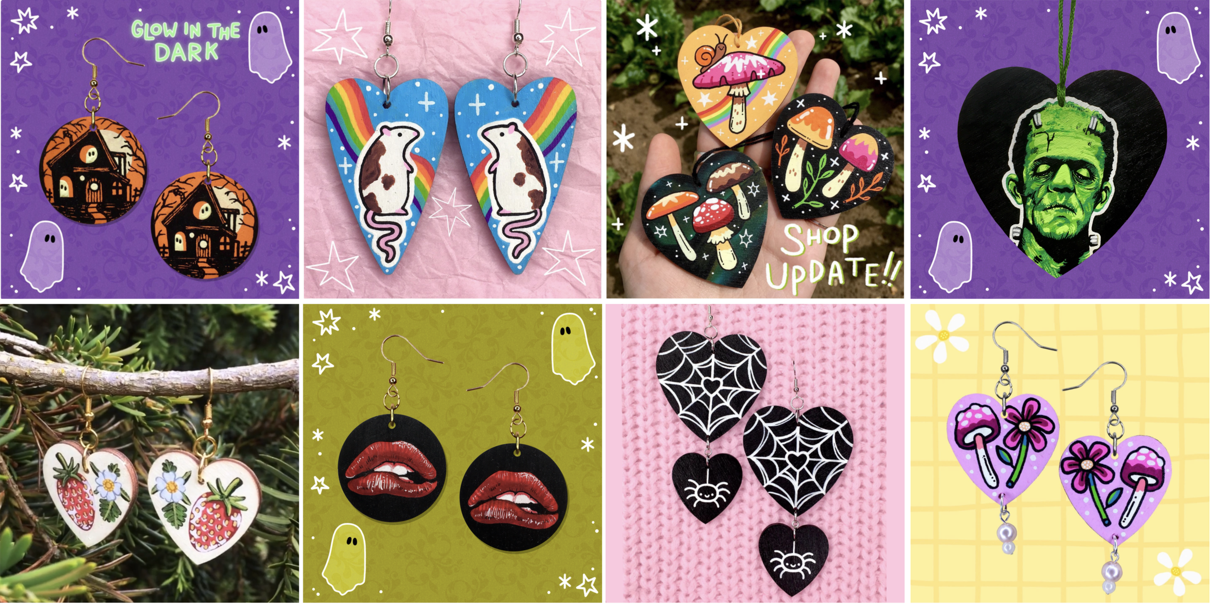 Probably the work I’m most known for, and definitely what I’ve made the most of! I have been working with Posca paint markers on wood since 2020, and I have made hundreds (if not thousands!) of pieces ever since. The jewellery in particular is by far my most popular product, and I have made many custom pieces for clients over the years. These pieces are almost always entirely free-handed, and they are something I’m likely to continue making for a very, very long time!